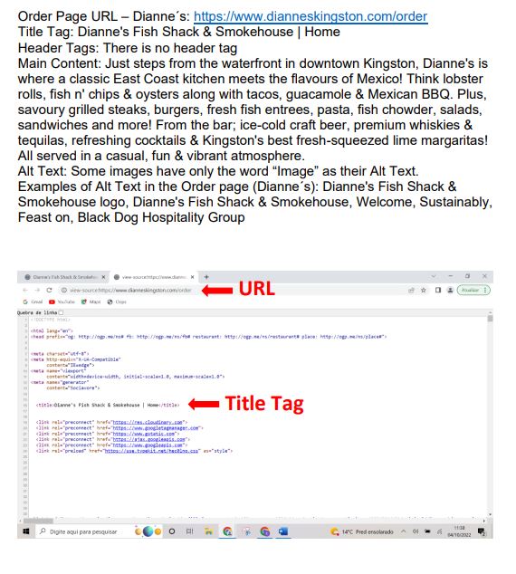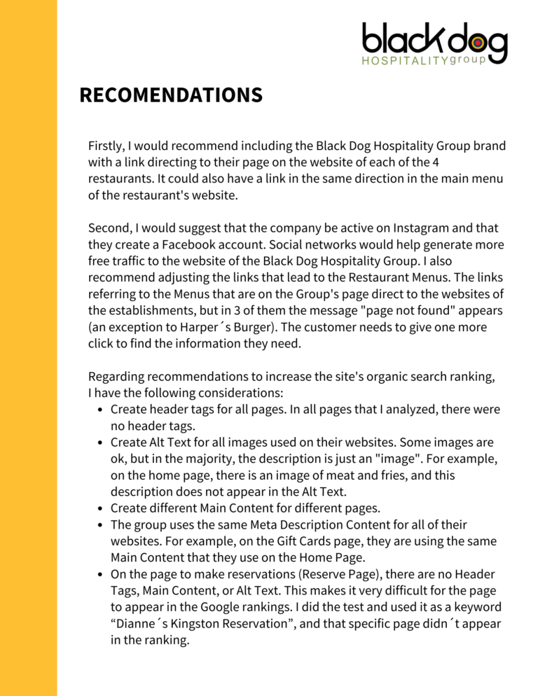 Conducted an SEO audit for the Black Dog Hospitality Group website and Dianne’s restaurant, which involved evaluating the Title Tag, Header Tag, Main Content, Alt Text, Google Analytics, and remarketing codes on the site.