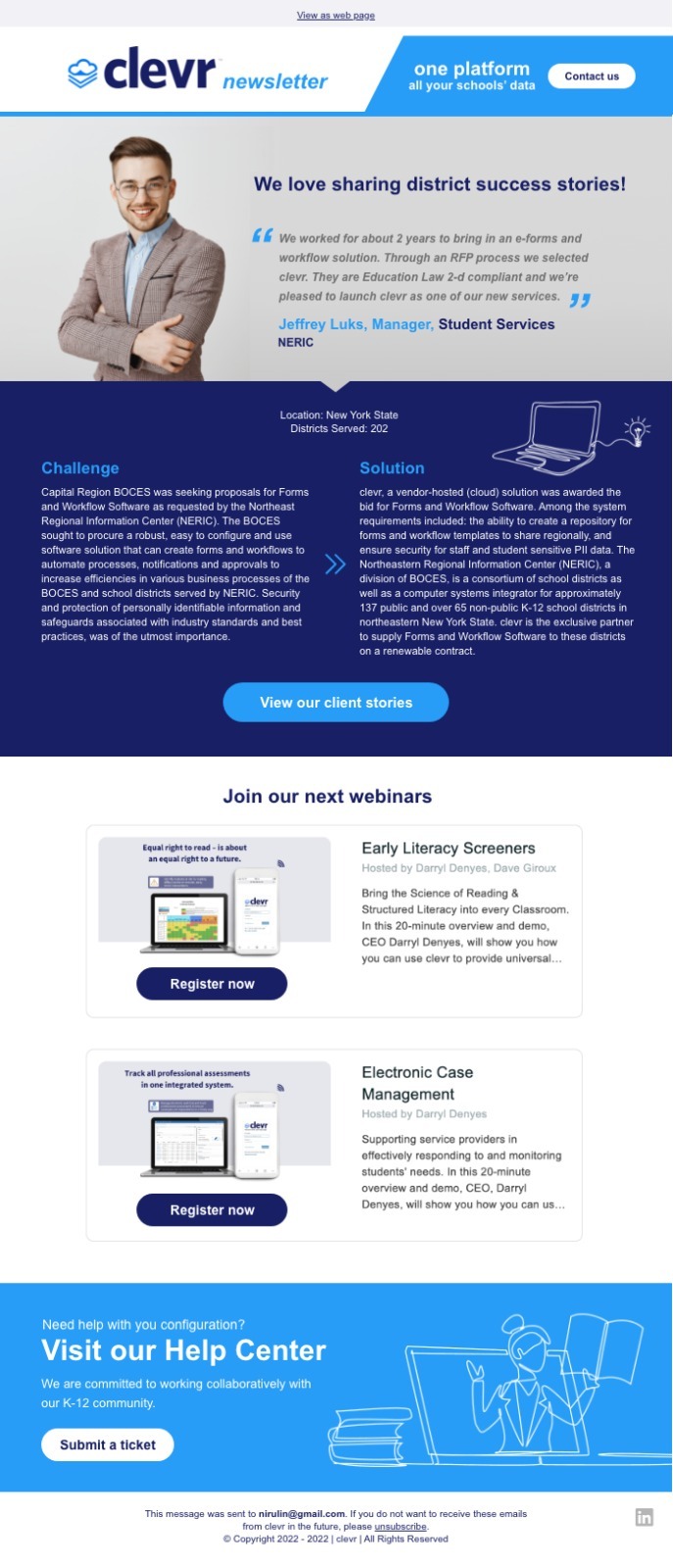 Clevr is a leading provider of cloud-based data collection and workflow solutions for education. The company builds and deploys its software solution exclusively for K-12 School Districts.