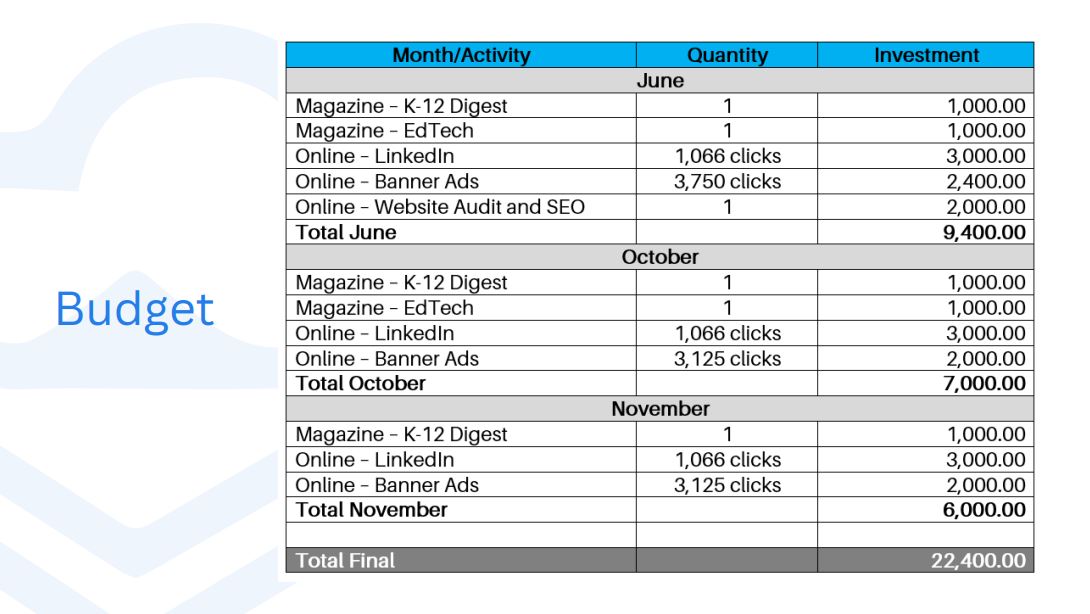 Regarding the media plan, the proposal involved ads in specialized magazines, banner ads, social media, website audit, SEO, and email marketing. We developed a budget for the campaign, and a calendar of activities, and established metrics and evaluation criteria to measure the results of each of the proposed marketing actions.