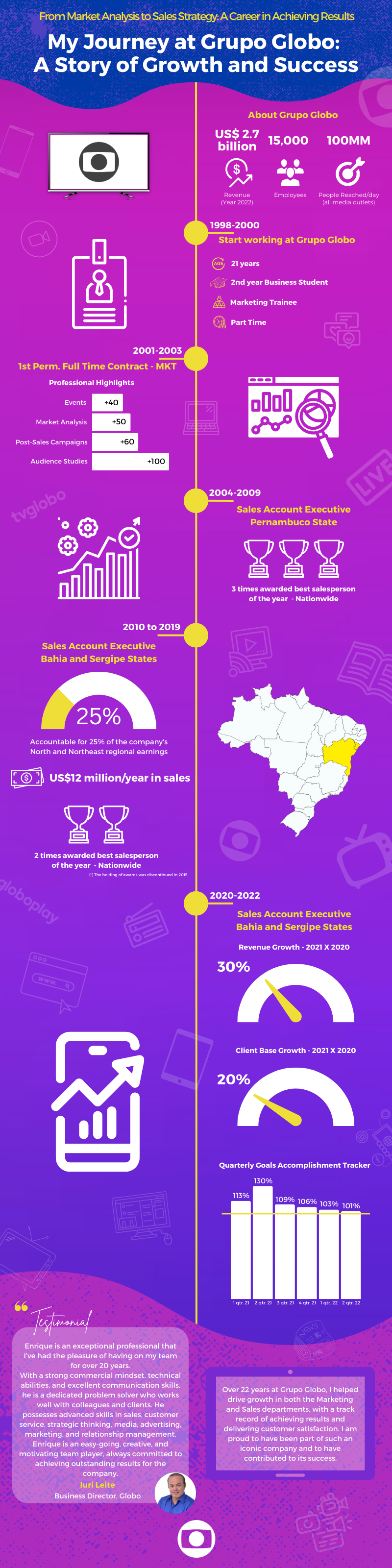 As I reflect on my career journey at Grupo Globo, I can’t help but feel a sense of pride and accomplishment. From conducting extensive market analyses to developing effective sales strategies, my experience at this esteemed organization had been nothing short of remarkable.
